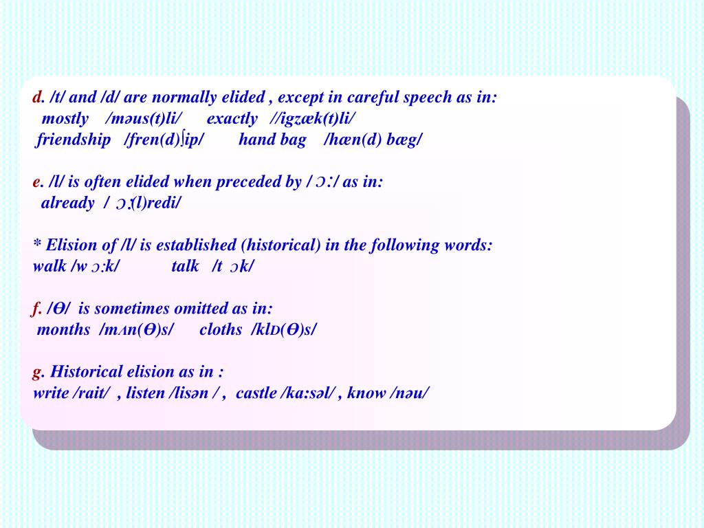 d. /t/ and /d/ are normally elided , except in careful speech as in: mostly /məus(t)li/ exactly //igzæk(t)li/ friendship /fren(d)∫ip/ hand bag /hæn(d) bæg/ e. /l/ is often elided when preceded by / / as in: already / (l)redi/ * Elision of /l/ is established (historical) in the following words: walk /w k/ talk /t k/ f. /Ө/ is sometimes omitted as in: months /mΛn(Ө)s/ cloths /klD(Ө)s/ g. Historical elision as in : write /rait/ , listen /lisən / , castle /ka:səl/ , know /nəu/ :c :c :c :c