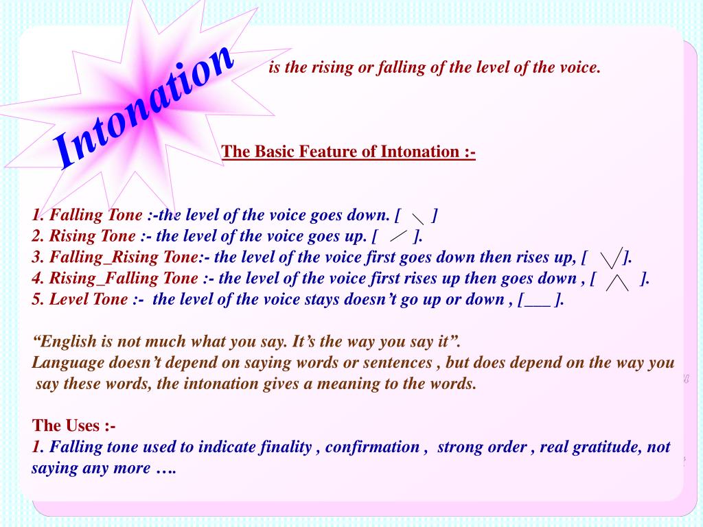 Intonation is the rising or falling of the level of the voice. The Basic Feature of Intonation :- 1. Falling Tone :-the level of the voice goes down. [ ] 2. Rising Tone :- the level of the voice goes up. [ ]. 3. Falling_Rising Tone:- the level of the voice first goes down then rises up, [ ]. 4. Rising_Falling Tone :- the level of the voice first rises up then goes down , [ ]. 5. Level Tone :- the level of the voice stays doesn’t go up or down , [___ ]. “English is not much what you say. It’s the way you say it”. Language doesn’t depend on saying words or sentences , but does depend on the way you say these words, the intonation gives a meaning to the words. The Uses :- 1. Falling tone used to indicate finality , confirmation , strong order , real gratitude, not saying any more ….