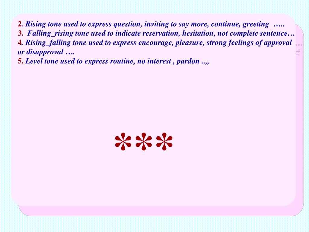2. Rising tone used to express question, inviting to say more, continue, greeting ….. 3. Falling_rising tone used to indicate reservation, hesitation, not complete sentence… 4. Rising_falling tone used to express encourage, pleasure, strong feelings of approval or disapproval …. 5. Level tone used to express routine, no interest , pardon ..,, ***