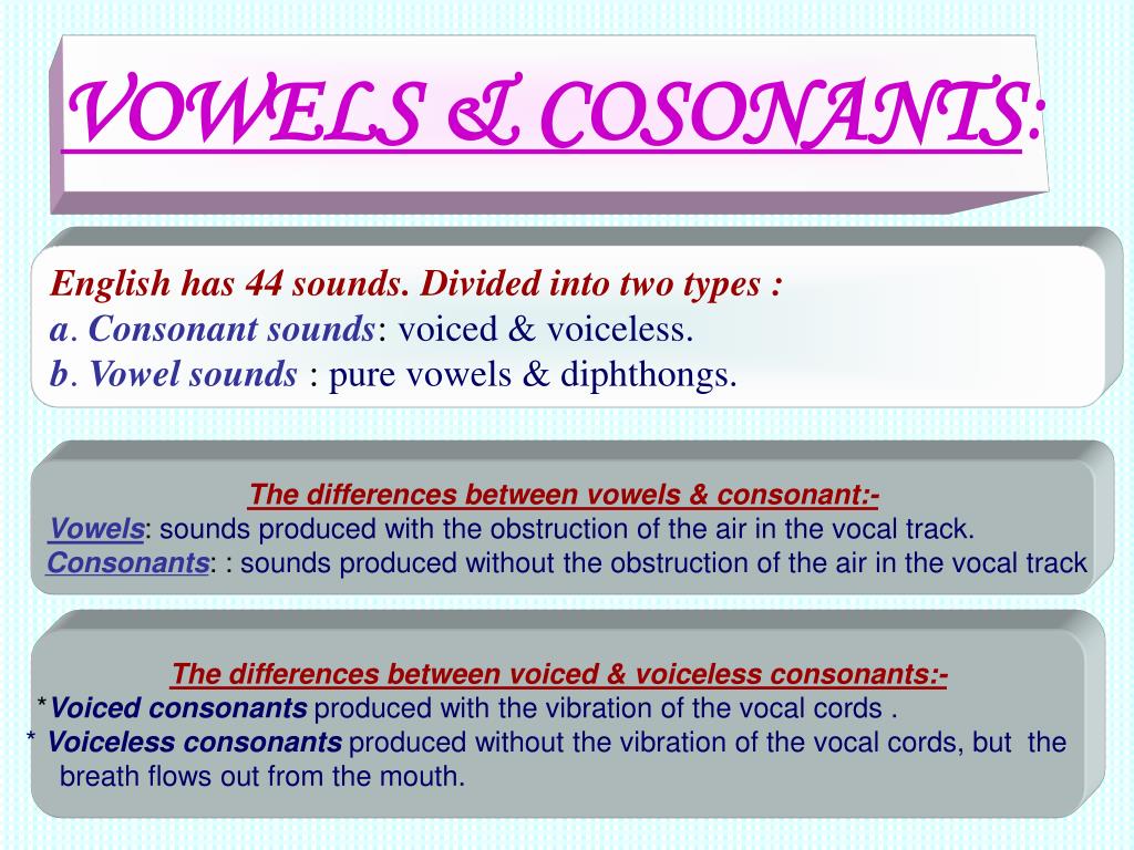 VOWELS & COSONANTS: English has 44 sounds. Divided into two types : a. Consonant sounds: voiced & voiceless. b. Vowel sounds : pure vowels & diphthongs. The differences between vowels & consonant:- Vowels: sounds produced with the obstruction of the air in the vocal track. Consonants: : sounds produced without the obstruction of the air in the vocal track The differences between voiced & voiceless consonants:- *Voiced consonants produced with the vibration of the vocal cords . * Voiceless consonants produced without the vibration of the vocal cords, but the breath flows out from the mouth.