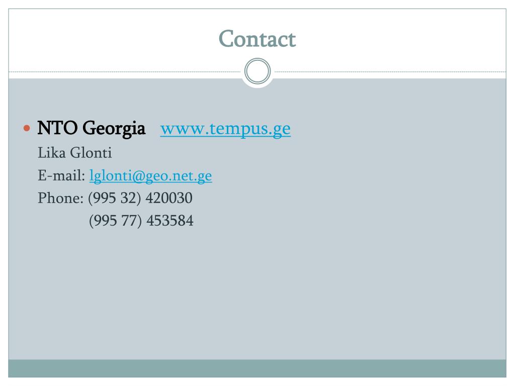 Contact • NTO Georgia www.tempus.ge Lika Glonti E-mail: lglonti@geo.net.ge Phone: (995 32) 420030 (995 77) 453584