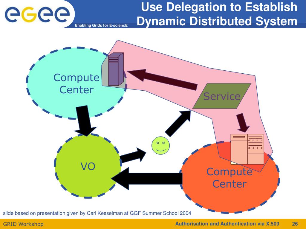 ComputeCenter Service VO ComputeCenter Use Delegation to Establish Dynamic Distributed System slide based on presentation given by Carl Kesselman at GGF Summer School 2004 Authorisation and Authentication via X.509