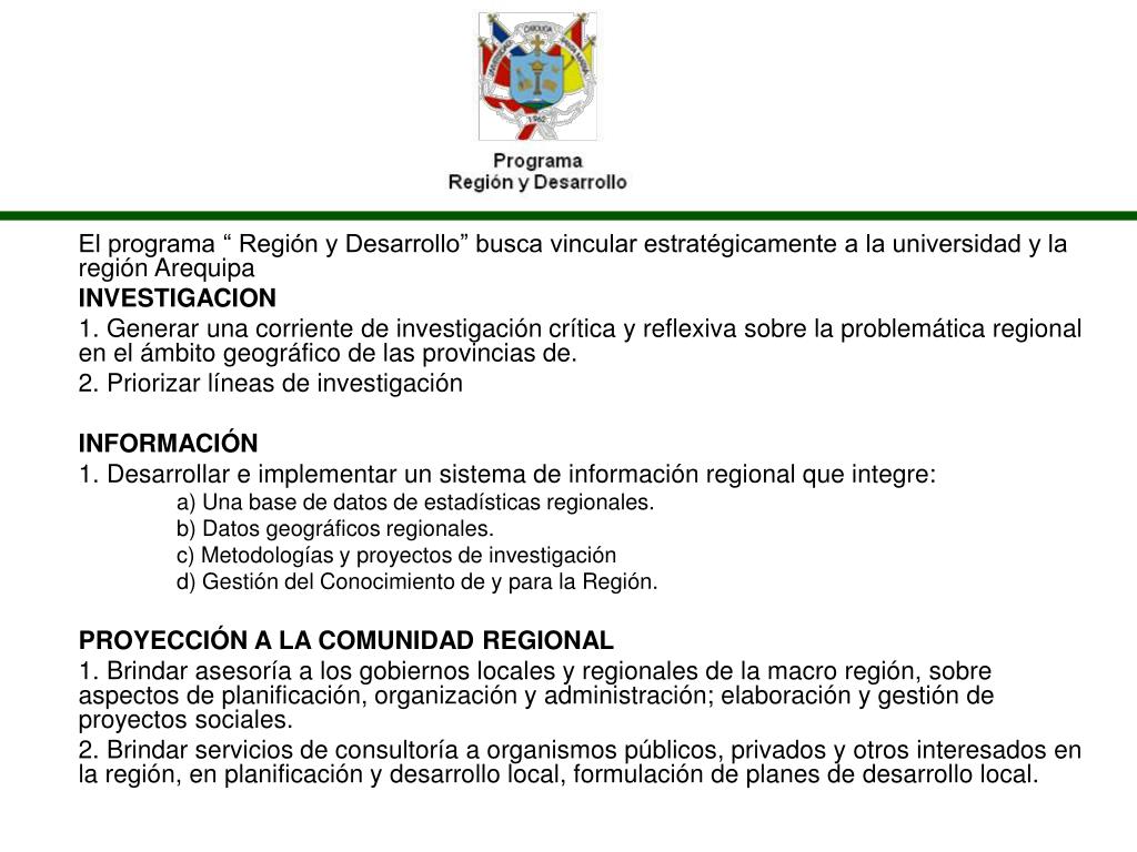 El programa “ Región y Desarrollo” busca vincular estratégicamente a la universidad y la región Arequipa INVESTIGACION 1. Generar una corriente de investigación crítica y reflexiva sobre la problemática regional en el ámbito geográfico de las provincias de. 2. Priorizar líneas de investigación INFORMACIÓN 1. Desarrollar e implementar un sistema de información regional que integre: a) Una base de datos de estadísticas regionales. b) Datos geográficos regionales. c) Metodologías y proyectos de investigación d) Gestión del Conocimiento de y para la Región. PROYECCIÓN A LA COMUNIDAD REGIONAL 1. Brindar asesoría a los gobiernos locales y regionales de la macro región, sobre aspectos de planificación, organización y administración; elaboración y gestión de proyectos sociales. 2. Brindar servicios de consultoría a organismos públicos, privados y otros interesados en la región, en planificación y desarrollo local, formulación de planes de desarrollo local.