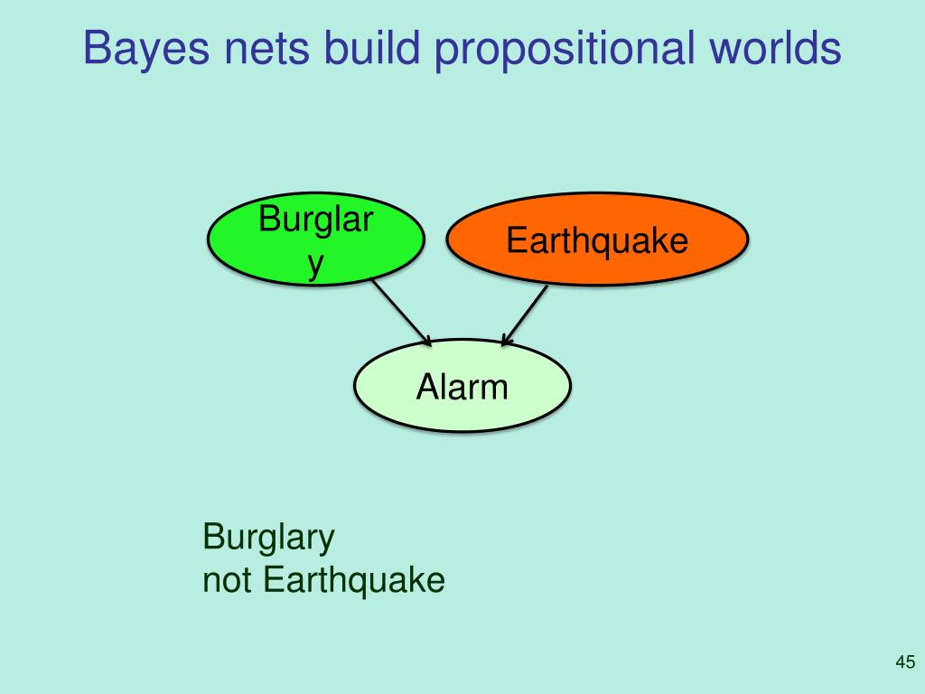 Bayes nets build propositional worlds Burglary Earthquake Alarm Burglary not Earthquake