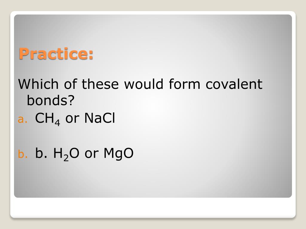 Which of these would form covalent bonds? • CH4 or NaCl • b. H2O or MgO Practice: