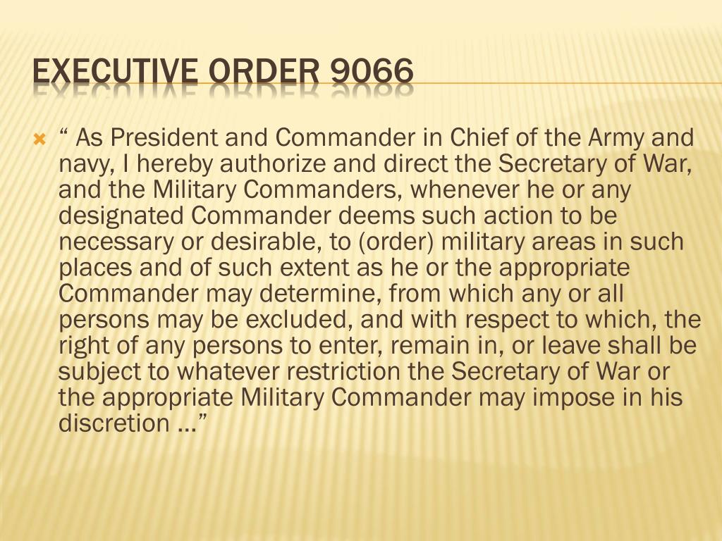 “ As President and Commander in Chief of the Army and navy, I hereby authorize and direct the Secretary of War, and the Military Commanders, whenever he or any designated Commander deems such action to be necessary or desirable, to (order) military areas in such places and of such extent as he or the appropriate Commander may determine, from which any or all persons may be excluded, and with respect to which, the right of any persons to enter, remain in, or leave shall be subject to whatever restriction the Secretary of War or the appropriate Military Commander may impose in his discretion …” Executive Order 9066
