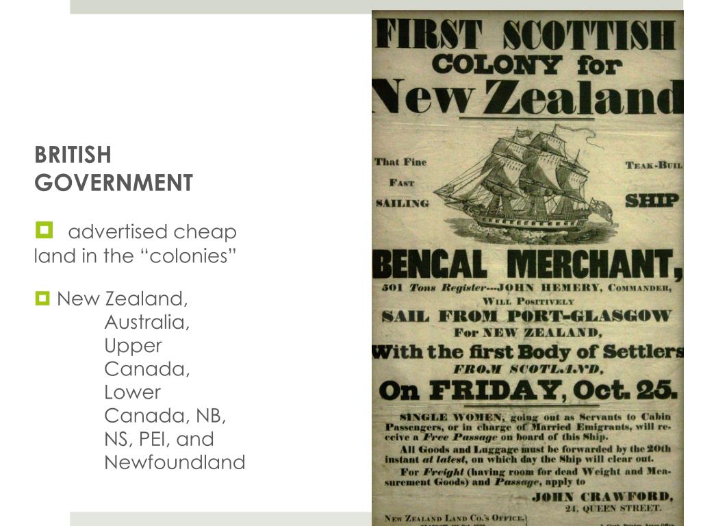 BRITISH GOVERNMENT • advertised cheap land in the “colonies” • New Zealand, Australia, Upper Canada, Lower Canada, NB, NS, PEI, and Newfoundland