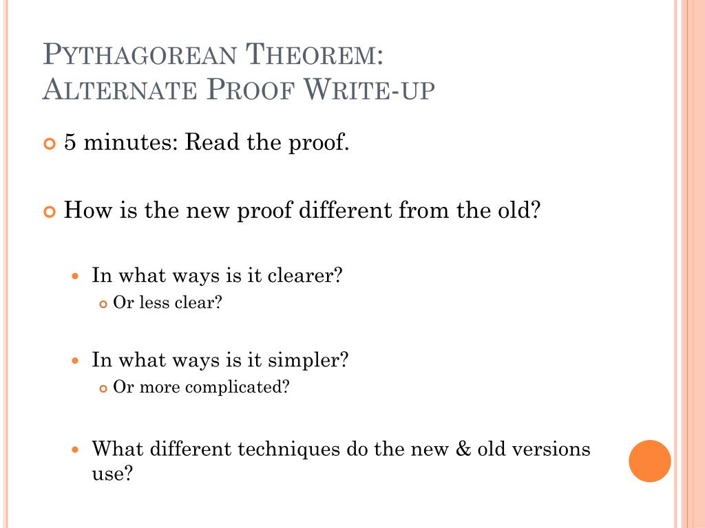 Pythagorean Theorem:Alternate Proof Write-up • 5 minutes: Read the proof. • How is the new proof different from the old? • In what ways is it clearer? • Or less clear? • In what ways is it simpler? • Or more complicated? • What different techniques do the new & old versions use?