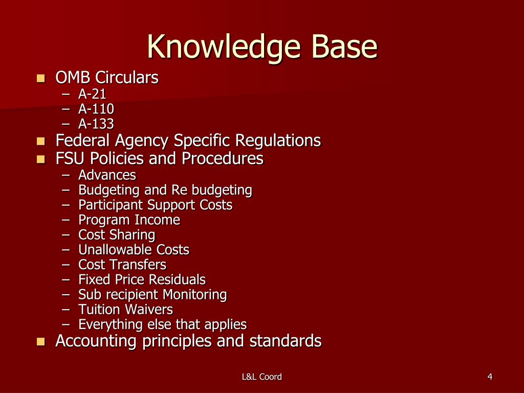 Knowledge Base • OMB Circulars • A-21 • A-110 • A-133 • Federal Agency Specific Regulations • FSU Policies and Procedures • Advances • Budgeting and Re budgeting • Participant Support Costs • Program Income • Cost Sharing • Unallowable Costs • Cost Transfers • Fixed Price Residuals • Sub recipient Monitoring • Tuition Waivers • Everything else that applies • Accounting principles and standards L&L Coord