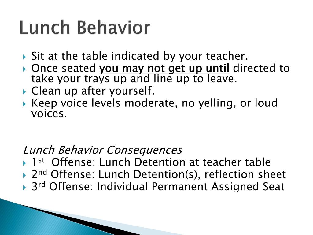 Lunch Behavior • Sit at the table indicated by your teacher. • Once seated you may not get up until directed to take your trays up and line up to leave. • Clean up after yourself. • Keep voice levels moderate, no yelling, or loud voices. Lunch Behavior Consequences • 1st Offense: Lunch Detention at teacher table • 2nd Offense: Lunch Detention(s), reflection sheet • 3rd Offense: Individual Permanent Assigned Seat