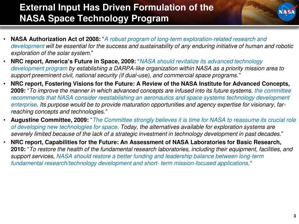 External Input Has Driven Formulation of the NASA Space Technology Program NASA Authorization Act of 2008: “A robust program of long-term exploration-related research and development will be essential for the success and sustainability of any enduring initiative of human and robotic exploration of the solar system.” NRC report, America’s Future in Space, 2009: “NASA should revitalize its advanced technology development program by establishing a DARPA-like organization within NASA as a priority mission area to support preeminent civil, national security (if dual-use), and commercial space programs.” NRC report, Fostering Visions for the Future: A Review of the NASA Institute for Advanced Concepts, 2009: “To improve the manner in which advanced concepts are infused into its future systems, the committee recommends that NASA consider reestablishing an aeronautics and space systems technology development enterprise. Its purpose would be to provide maturation opportunities and agency expertise for visionary, far-reaching concepts and technologies.” Augustine Committee, 2009: “The Committee strongly believes it is time for NASA to reassume its crucial role of developing new technologies for space. Today, the alternatives available for exploration systems are severely limited because of the lack of a strategic investment in technology development in past decades.” NRC report, Capabilities for the Future: An Assessment of NASA Laboratories for Basic Research, 2010: “To restore the health of the fundamental research laboratories, including their equipment, facilities, and support services, NASA should restore a better funding and leadership balance between long-term fundamental research/technology development and short- term mission-focused applications.“