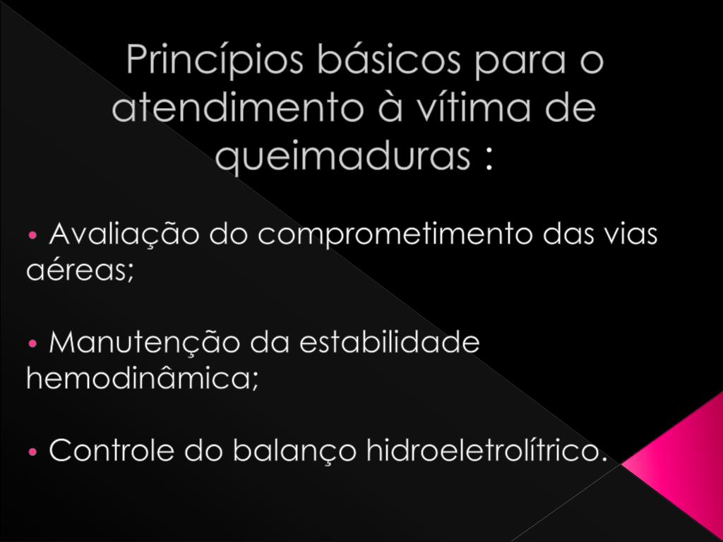 Princípios básicos para o atendimento à vítima de queimaduras : Avaliação do comprometimento das vias aéreas; Manutenção da estabilidade hemodinâmica; Controle do balanço hidroeletrolítrico.