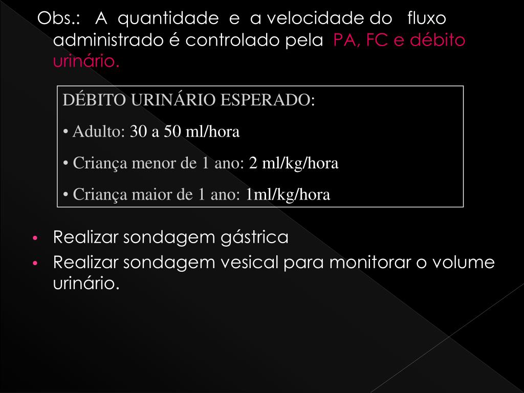 DÉBITO URINÁRIO ESPERADO: • Adulto: 30 a 50 ml/hora • Criança menor de 1 ano: 2 ml/kg/hora • Criança maior de 1 ano: 1ml/kg/hora Obs.: A quantidade e a velocidade do fluxo administrado é controlado pela PA, FC e débitourinário. • Realizar sondagem gástrica • Realizar sondagem vesical para monitorar o volume urinário.