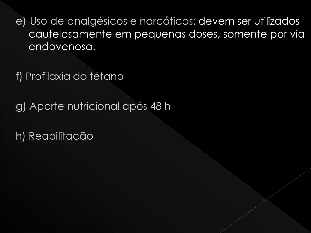 e)Uso de analgésicos e narcóticos: devem ser utilizados cautelosamente em pequenas doses, somente por via endovenosa. f) Profilaxia do tétano g) Aporte nutricional após 48 h h) Reabilitação