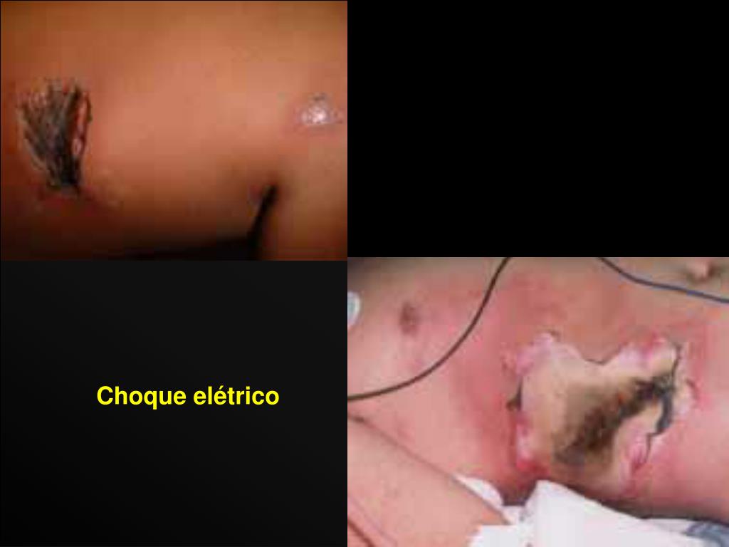 b) Queimaduras elétricas: são produzidas pelo contato direto entre o corpo e a fonte elétrica. A gravidade é determinada pelo trajeto da corrente através do corpo. • Lesões musculares • Desordens elétricas do miocárdio • Lesões ósseas e de órgãos vitais