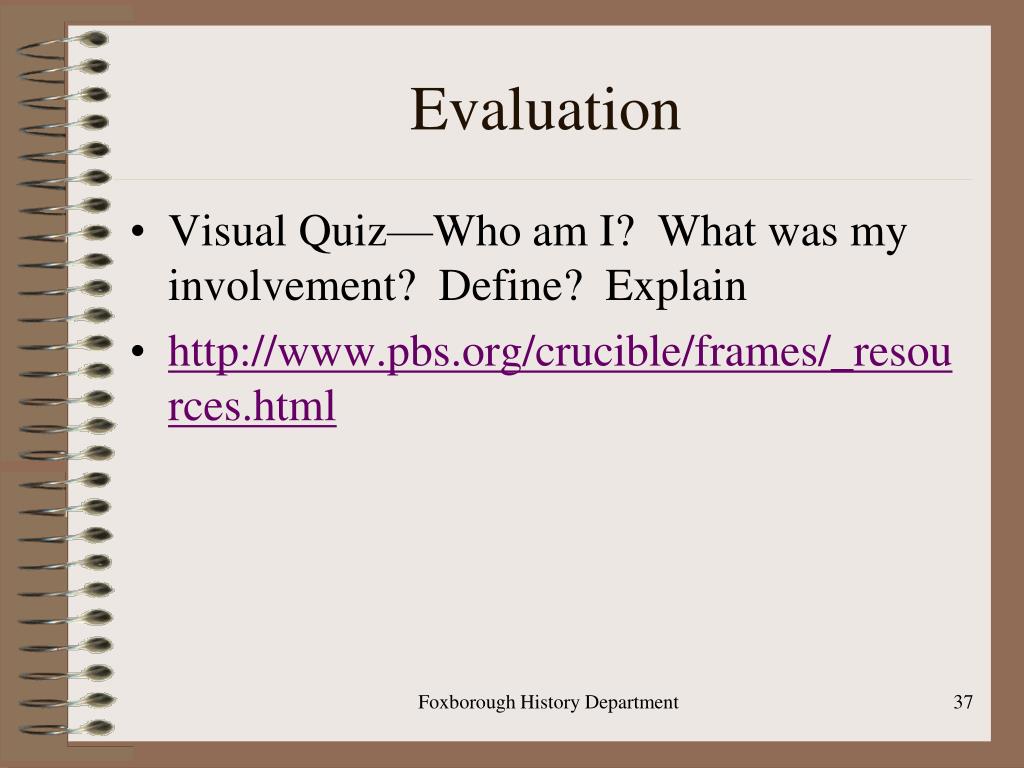 Evaluation • Visual Quiz—Who am I? What was my involvement? Define? Explain • http://www.pbs.org/crucible/frames/_resources.html Foxborough History Department