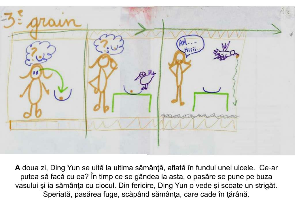 Câteva desene Care ilustrează începutul poveştii: Tatăl primeşte cele trei grăunţe: el îl fierbe pe primul, mama se ocupă de al doilea, Ding Yun caută să vadă ce să facă cu al treilea. Pentru a vă permite să urmăriţi mai bine prezentarea, fragmentele de text potrivite au fost adăugate desenelor, ceea ce nu s-a întâmplat în clasă!