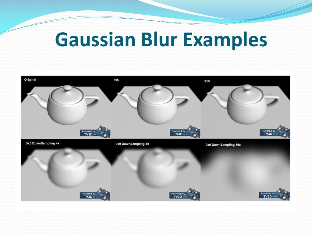 Gaussian Blur (continues…) • If the blurring is done in one pass the area that we have to blur is proportional to the blur diameter squared (d2). This is very expensive when the area becomes very large. It can instead be done in two separate passes (separable convolution) which will reduce the area that's needed to blur down to 2d instead, first blur along the x-axis (horizontally) and then blur the horizontal blur along the y-axis (vertically).