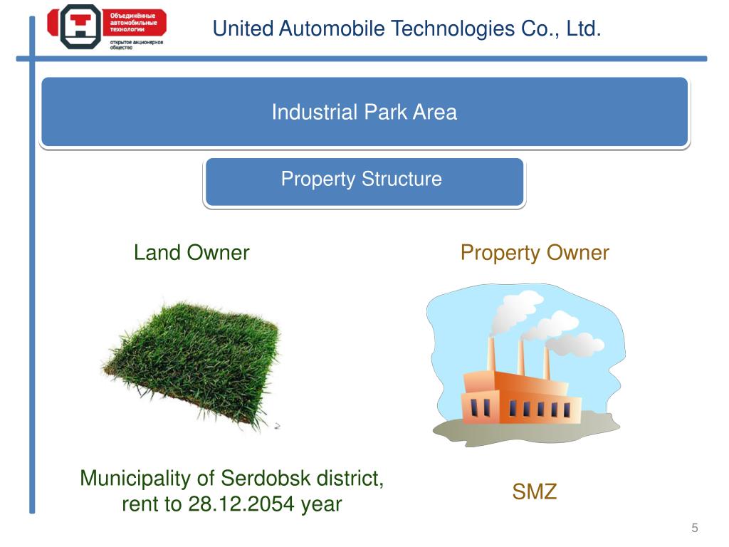 United Automobile Technologies Co., Ltd. Industrial Park Area Property Structure Land Owner Property Owner SMZ Municipality of Serdobsk district, rent to 28.12.2054 year 5