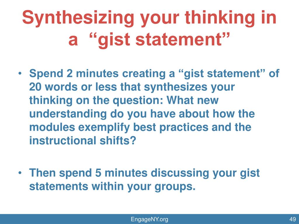 Synthesizing your thinking in a “gist statement” Spend 2 minutes creating a “gist statement” of 20 words or less that synthesizes your thinking on the question: What new understanding do you have about how the modules exemplify best practices and the instructional shifts? Then spend 5 minutes discussing your gist statements within your groups. EngageNY.org