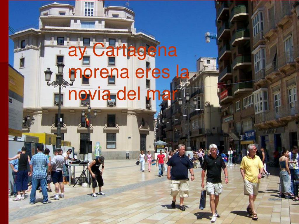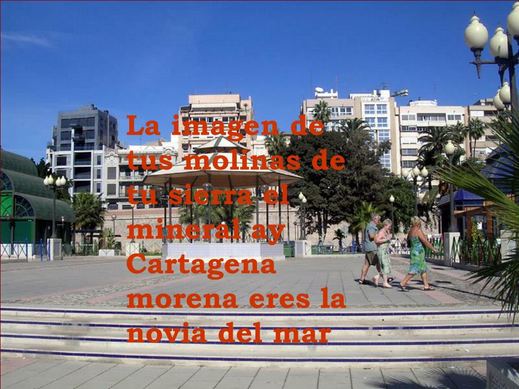 Tus mujeres hermosas son manojos de rosas de color sin igual y en su pecho la medalla de la virgen de la caridad Tus mujeres hermosas son manojos de rosas de color sin igual y en su pecho la medalla de la virgen de la caridad Eres una flor marina andaluza y levantina que se abre en un cantar, tienes toda la fragancia de los jardines de España eres muñeca de sal La imagen de tus molinas de tu sierra el mineral ay Cartagena morena eres la novia del mar ay Cartagena morena eres la novia del mar