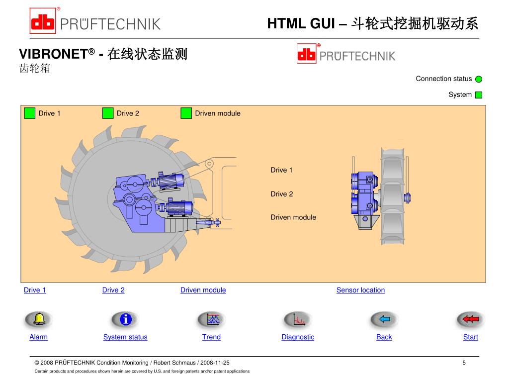 VIBRONET - 在线状态监测 齿轮箱 Alarm System status Trend Diagnostic Back Start Connection status System Drive 1 Drive 2 Driven module Drive 1 Drive 2 Driven module Drive 1 Drive 2 Driven module Sensor location HTML GUI – 斗轮式挖掘机驱动系 Certain products and procedures shown herein are covered by U.S. and foreign patents and/or patent applications