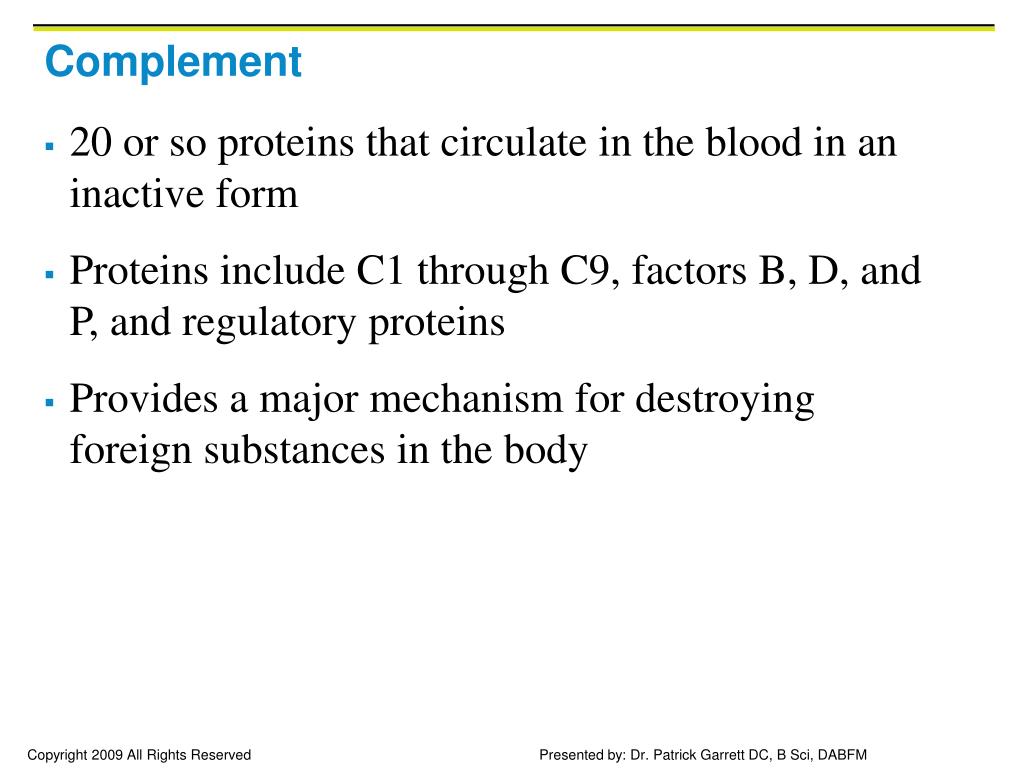 Complement • 20 or so proteins that circulate in the blood in an inactive form • Proteins include C1 through C9, factors B, D, and P, and regulatory proteins • Provides a major mechanism for destroying foreign substances in the body