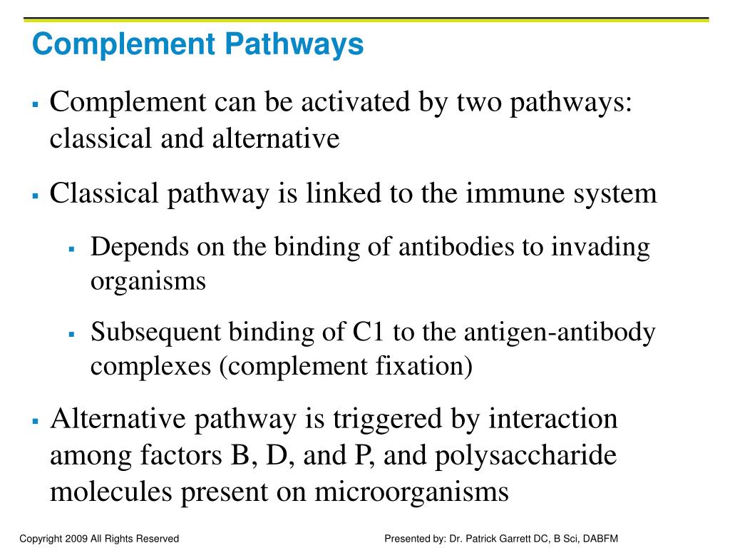 Complement Pathways • Complement can be activated by two pathways: classical and alternative • Classical pathway is linked to the immune system • Depends on the binding of antibodies to invading organisms • Subsequent binding of C1 to the antigen-antibody complexes (complement fixation) • Alternative pathway is triggered by interaction among factors B, D, and P, and polysaccharide molecules present on microorganisms