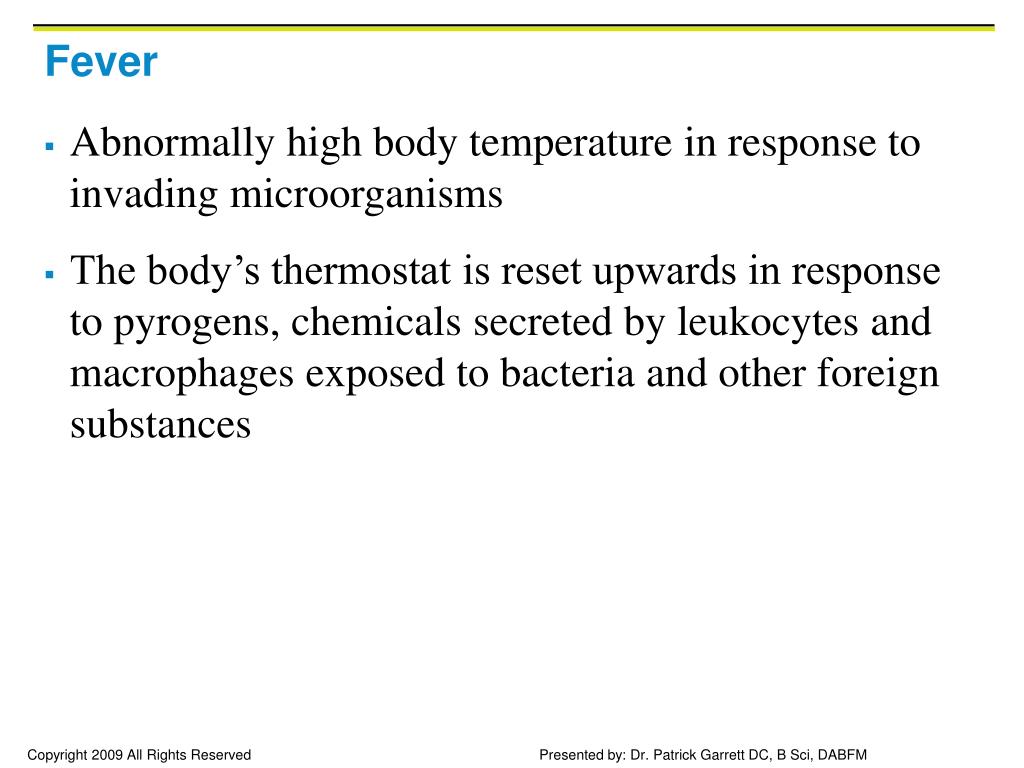 Fever • Abnormally high body temperature in response to invading microorganisms • The body’s thermostat is reset upwards in response to pyrogens, chemicals secreted by leukocytes and macrophages exposed to bacteria and other foreign substances