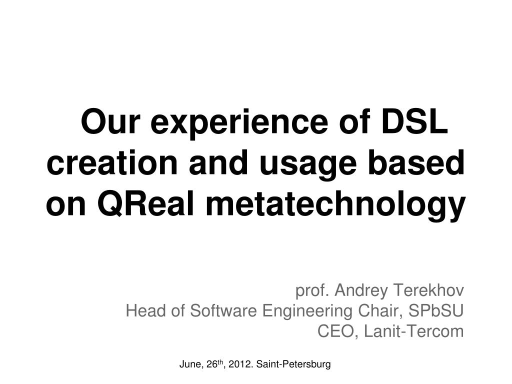 Our experience of DSL creation and usage based on QReal metatechnology prof. Andrey TerekhovHead of Software Engineering Chair, SPbSU CEO, Lanit-Tercom June, 26th, 2012. Saint-Petersburg