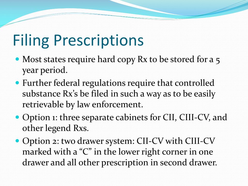 Filing Prescriptions • Most states require hard copy Rx to be stored for a 5 year period. • Further federal regulations require that controlled substance Rx’s be filed in such a way as to be easily retrievable by law enforcement. • Option 1: three separate cabinets for CII, CIII-CV, and other legend Rxs. • Option 2: two drawer system: CII-CV with CIII-CV marked with a “C” in the lower right corner in one drawer and all other prescription in second drawer.