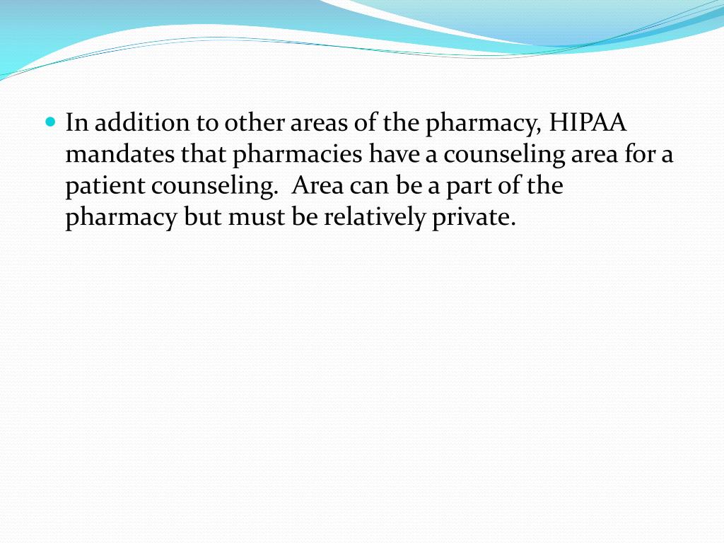 In addition to other areas of the pharmacy, HIPAA mandates that pharmacies have a counseling area for a patient counseling. Area can be a part of the pharmacy but must be relatively private.