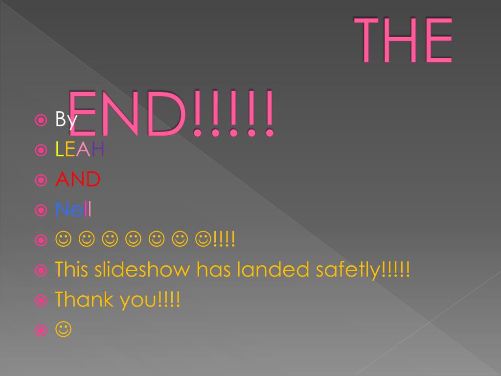 THE END!!!!! • By • LEAH • AND • Nell • !!!! • This slideshow has landed safetly!!!!! • Thank you!!!! •