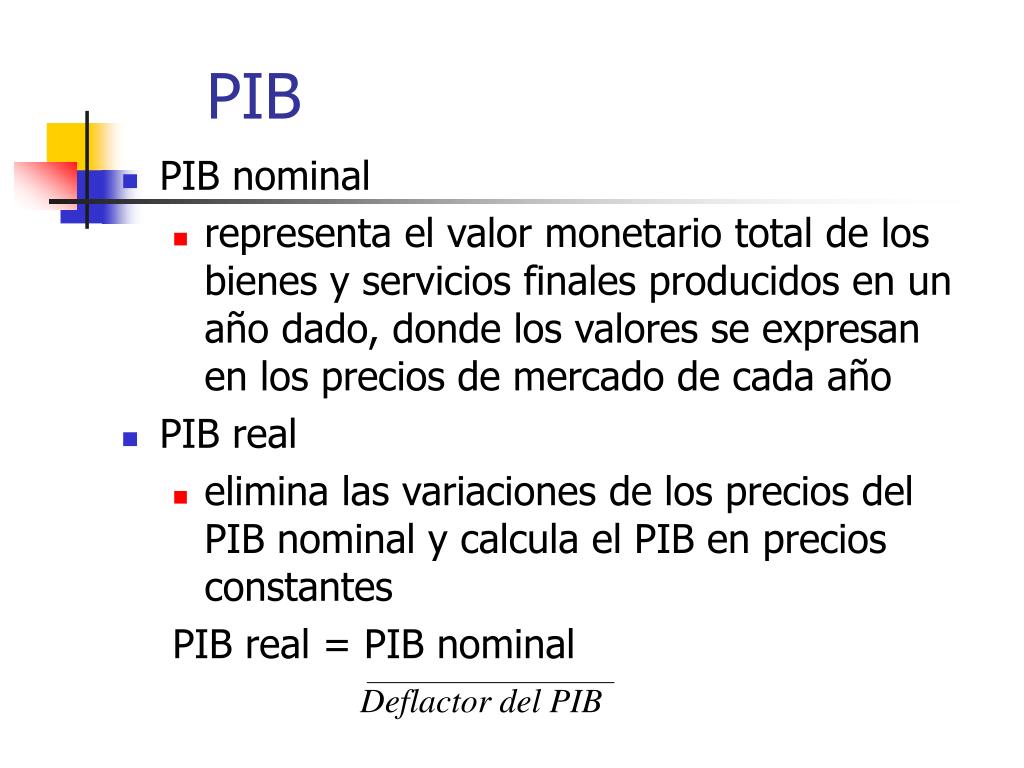 PIB • PIB nominal • representa el valor monetario total de los bienes y servicios finales producidos en un año dado, donde los valores se expresan en los precios de mercado de cada año • PIB real • elimina las variaciones de los precios del PIB nominal y calcula el PIB en precios constantes PIB real = PIB nominal Deflactor del PIB