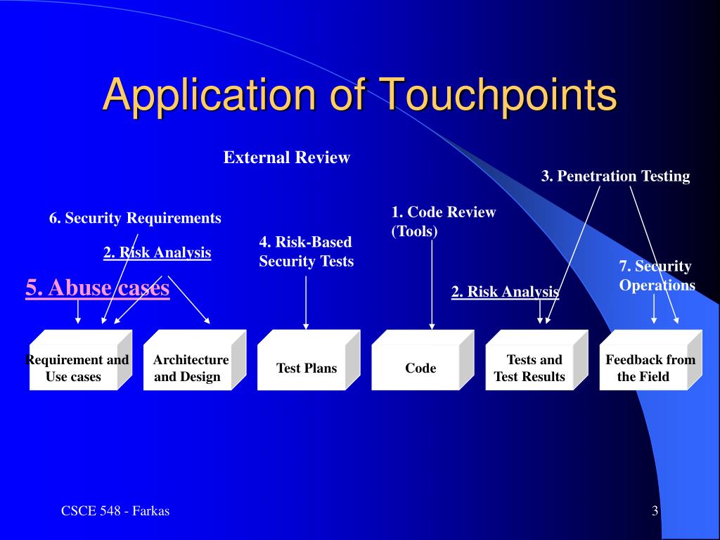 Application of Touchpoints External Review 3. Penetration Testing 1. Code Review (Tools) 6. Security Requirements 4. Risk-Based Security Tests 2. Risk Analysis 7. Security Operations 5. Abuse cases 2. Risk Analysis Requirement and Use cases Architecture and Design Test Plans Code Tests and Test Results Feedback from the Field
