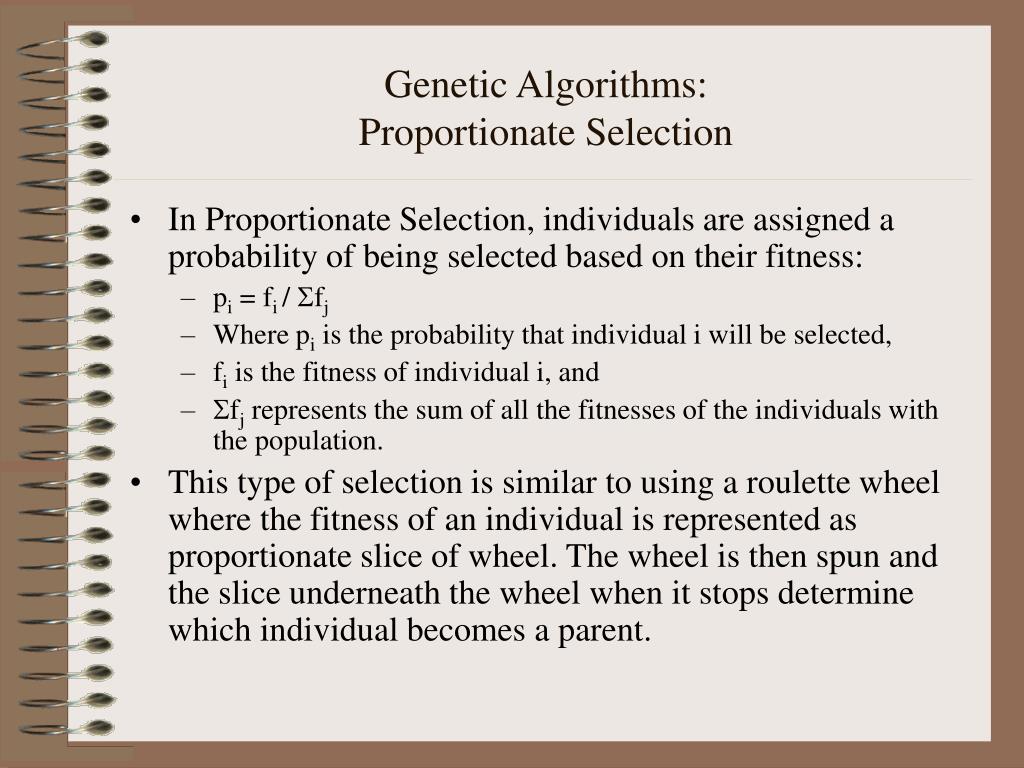 Genetic Algorithms:Proportionate Selection • In Proportionate Selection, individuals are assigned a probability of being selected based on their fitness: • pi = fi / fj • Where pi is the probability that individual i will be selected, • fi is the fitness of individual i, and • fj represents the sum of all the fitnesses of the individuals with the population. • This type of selection is similar to using a roulette wheel where the fitness of an individual is represented as proportionate slice of wheel. The wheel is then spun and the slice underneath the wheel when it stops determine which individual becomes a parent.