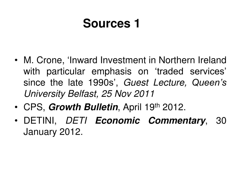 Sources 1 • M. Crone, ‘Inward Investment in Northern Ireland with particular emphasis on ‘traded services’ since the late 1990s’, Guest Lecture, Queen’s University Belfast, 25 Nov 2011 • CPS, Growth Bulletin, April 19th 2012. • DETINI, DETI Economic Commentary, 30 January 2012.