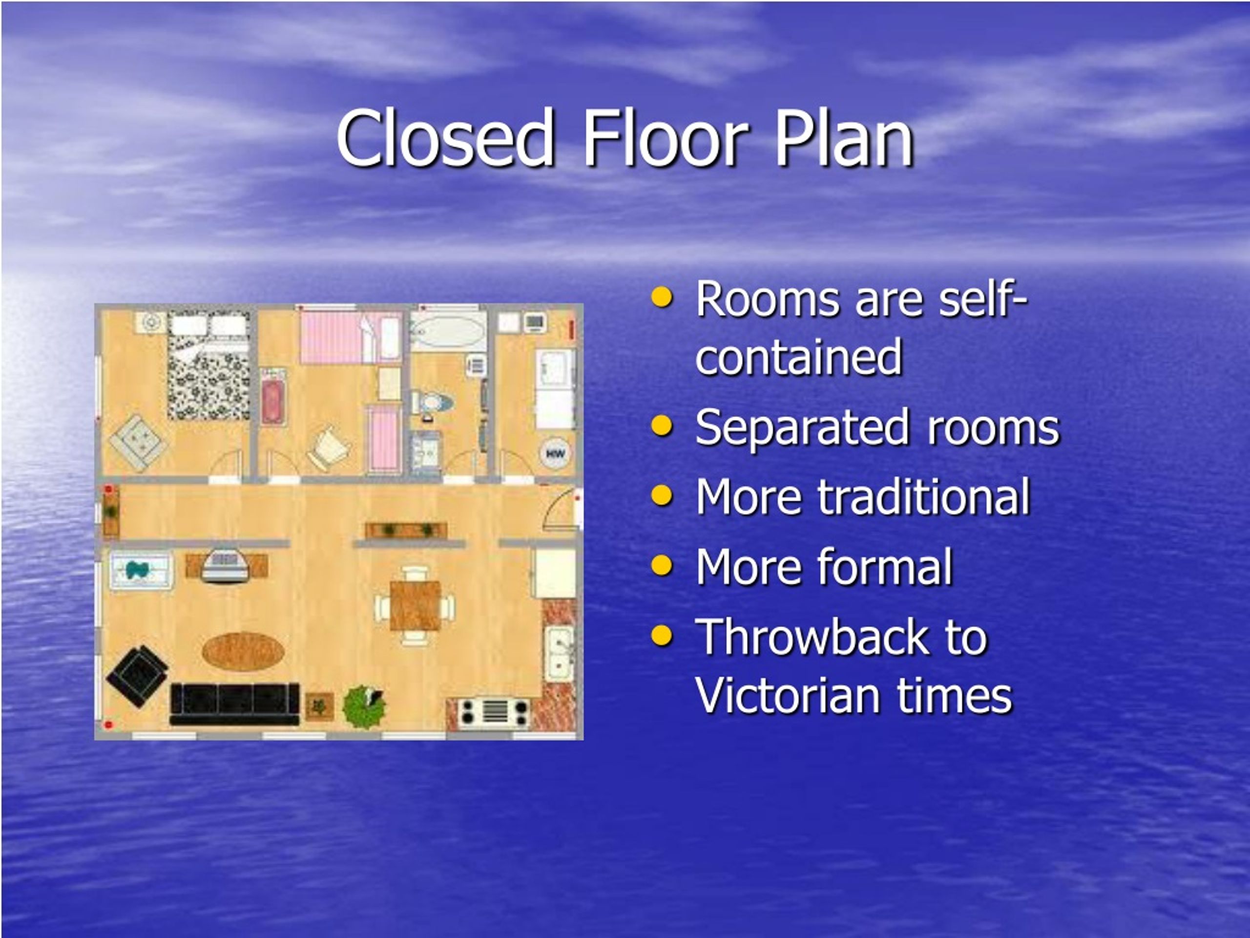 Closed Floor Plan • Rooms are self-contained • Separated rooms • More traditional • More formal • Throwback to Victorian times