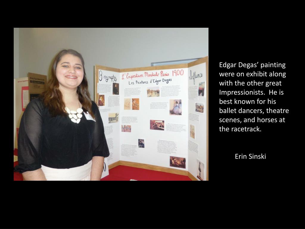 Edgar Degas’ painting were on exhibit along with the other great Impressionists. He is best known for his ballet dancers, theatre scenes, and horses at the racetrack. Erin Sinski