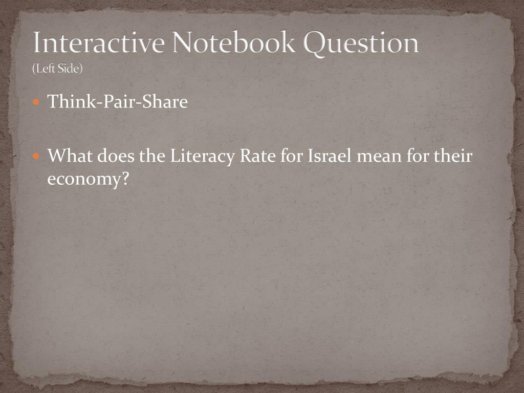 Interactive Notebook Question(Left Side) • Think-Pair-Share • What does the Literacy Rate for Israel mean for their economy?