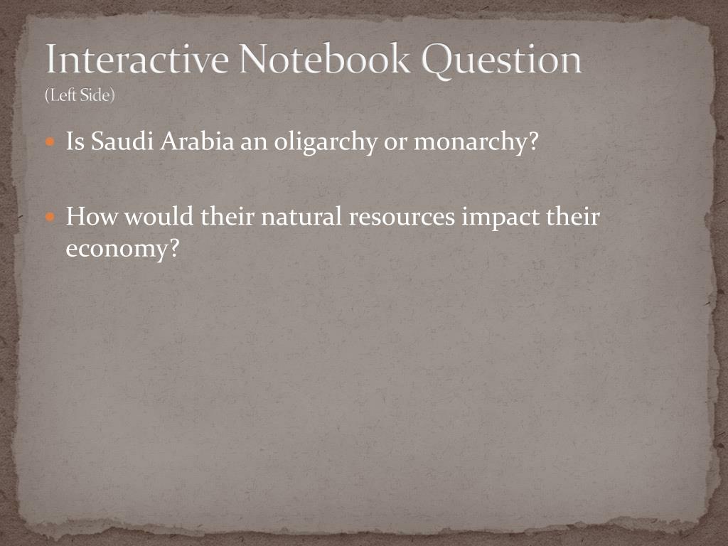 Interactive Notebook Question(Left Side) • Is Saudi Arabia an oligarchy or monarchy? • How would their natural resources impact their economy?