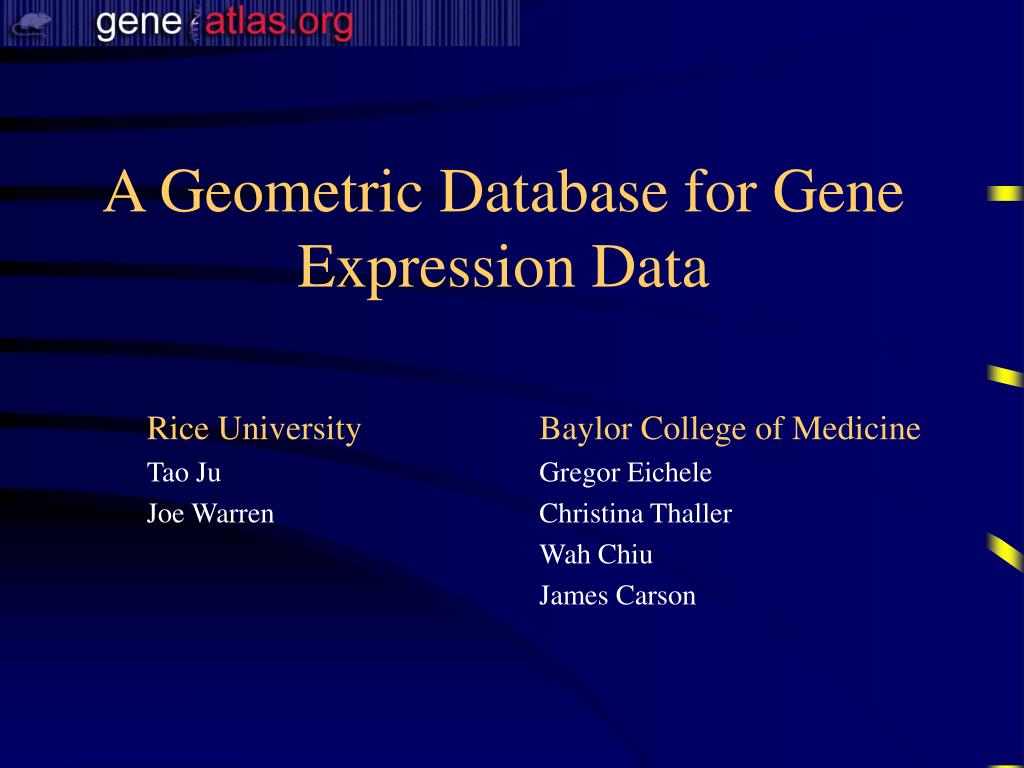 A Geometric Database for Gene Expression Data Rice University Tao Ju Joe Warren Baylor College of Medicine Gregor Eichele Christina Thaller Wah Chiu James Carson