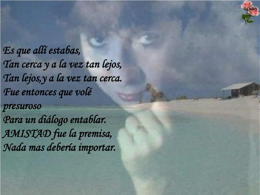 GLADIS Es que allí estabas, Tan cerca y a la vez tan lejos, Tan lejos,y a la vez tan cerca. Fue entonces que volé presuroso Para un diálogo entablar. AMISTAD fue la premisa, Nada mas debería importar.
