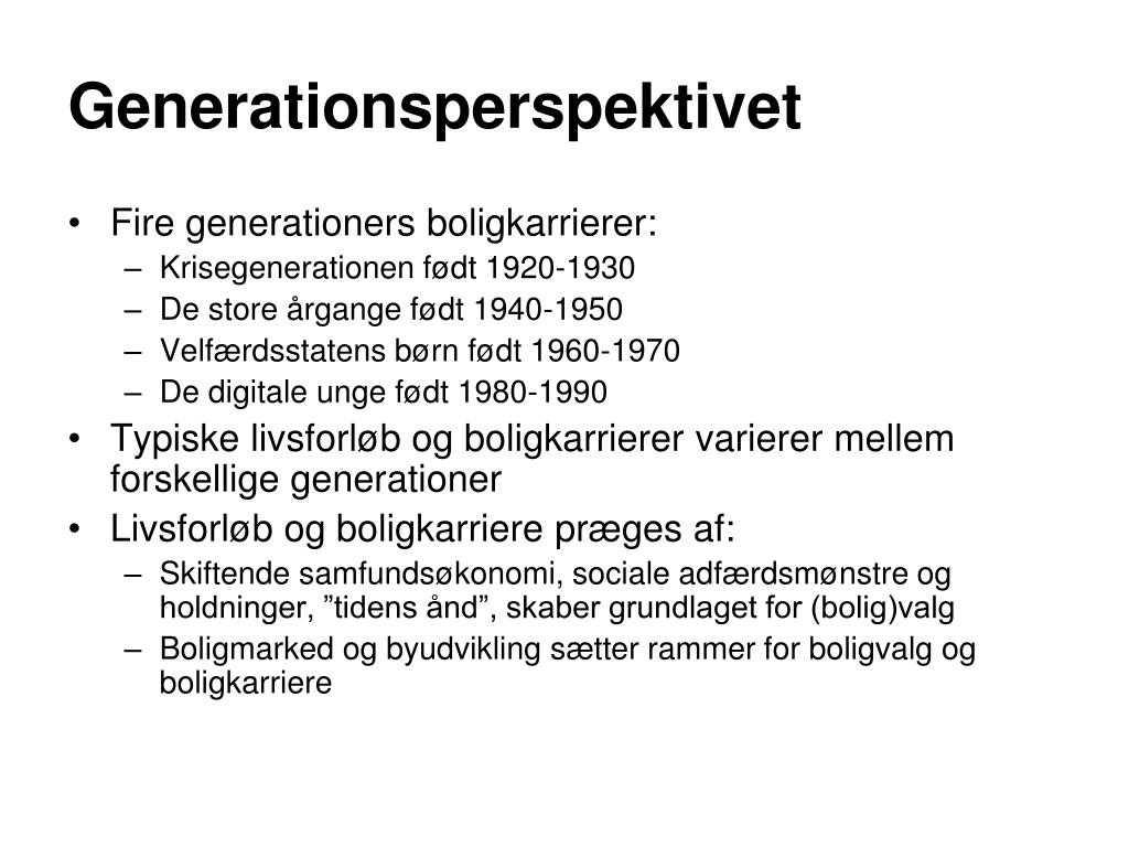 Generationsperspektivet • Fire generationers boligkarrierer: • Krisegenerationen født 1920-1930 • De store årgange født 1940-1950 • Velfærdsstatens børn født 1960-1970 • De digitale unge født 1980-1990 • Typiske livsforløb og boligkarrierer varierer mellem forskellige generationer • Livsforløb og boligkarriere præges af: • Skiftende samfundsøkonomi, sociale adfærdsmønstre og holdninger, ”tidens ånd”, skaber grundlaget for (bolig)valg • Boligmarked og byudvikling sætter rammer for boligvalg og boligkarriere