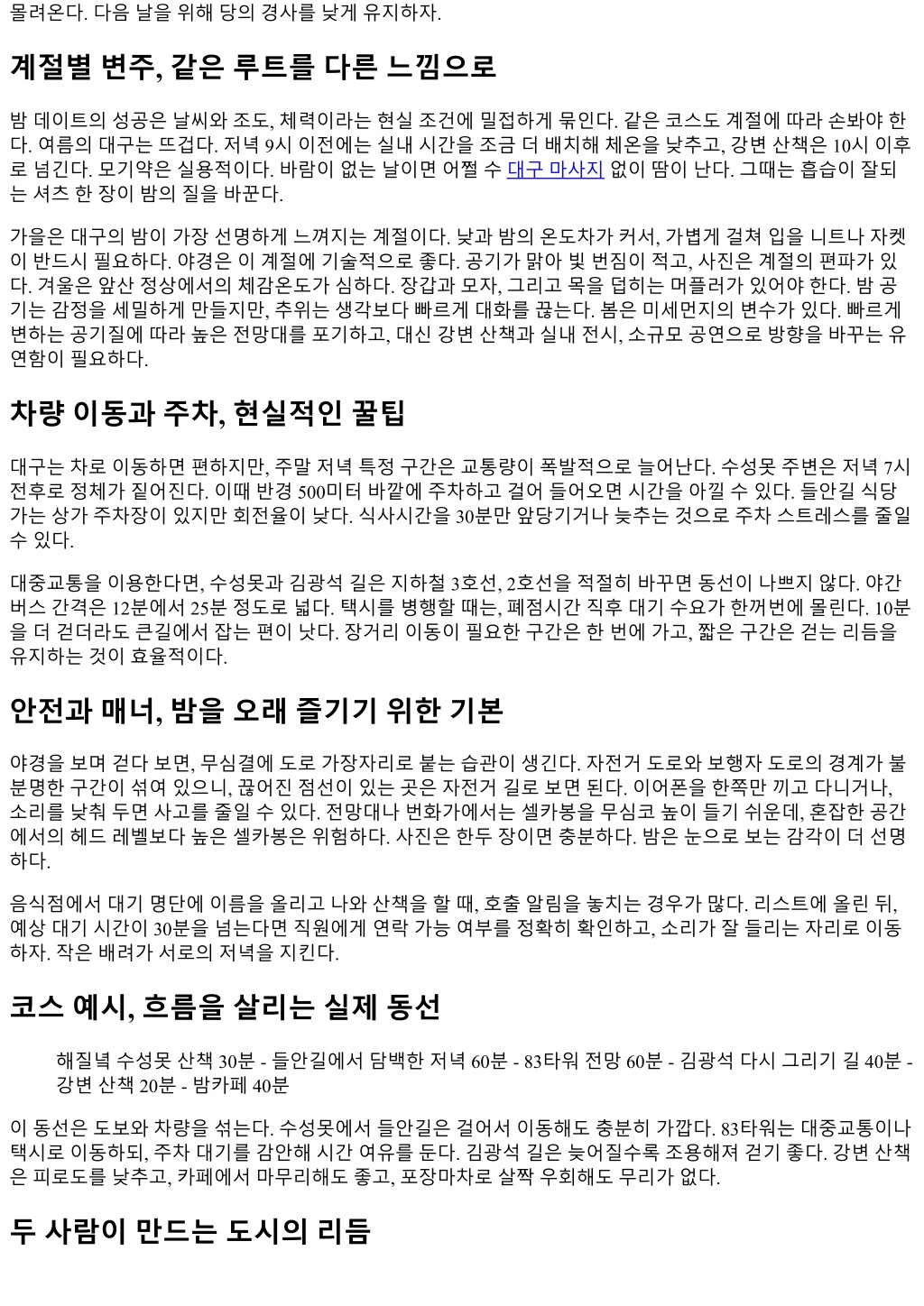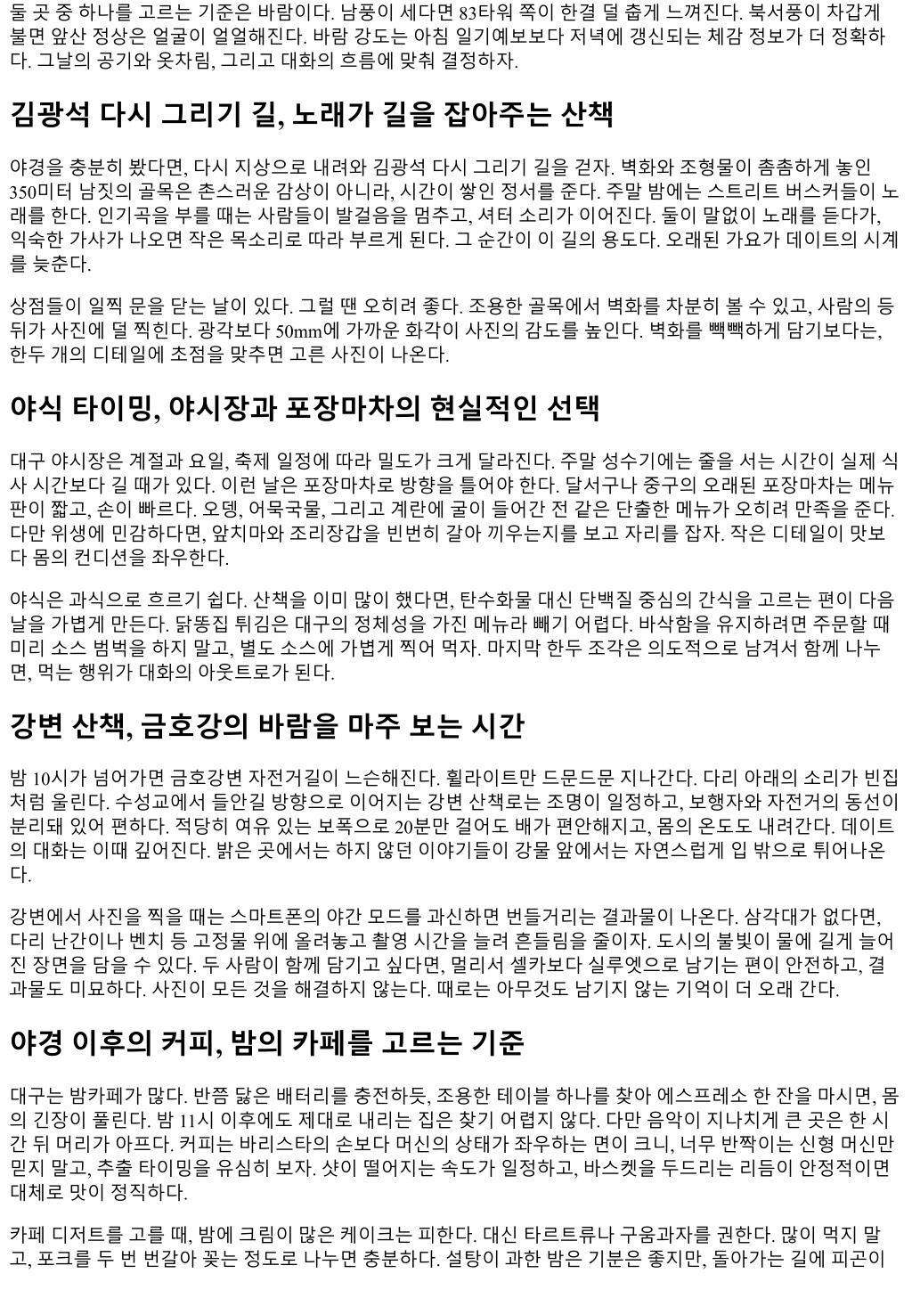 둘곳중하나를고르는기준은바람이다. 남풍이세다면 83타워쪽이한결덜춥게느껴진다. 북서풍이차갑게 불면앞산정상은얼굴이얼얼해진다. 바람강도는아침일기예보보다저녁에갱신되는체감정보가더정확하 다. 그날의공기와옷차림, 그리고대화의흐름에맞춰결정하자. 김광석다시그리기길, 노래가길을잡아주는산책 야경을충분히봤다면, 다시지상으로내려와김광석다시그리기길을걷자. 벽화와조형물이촘촘하게놓인 350미터남짓의골목은촌스러운감상이아니라, 시간이쌓인정서를준다. 주말밤에는스트리트버스커들이노 래를한다. 인기곡을부를때는사람들이발걸음을멈추고, 셔터소리가이어진다. 둘이말없이노래를듣다가, 익숙한가사가나오면작은목소리로따라부르게된다. 그순간이이길의용도다. 오래된가요가데이트의시계 를늦춘다. 상점들이일찍문을닫는날이있다. 그럴땐오히려좋다. 조용한골목에서벽화를차분히볼수있고, 사람의등 뒤가사진에덜찍힌다. 광각보다 50mm에가까운화각이사진의감도를높인다. 벽화를빽빽하게담기보다는, 한두개의디테일에초점을맞추면고른사진이나온다. 야식타이밍, 야시장과포장마차의현실적인선택 대구야시장은계절과요일, 축제일정에따라밀도가크게달라진다. 주말성수기에는줄을서는시간이실제식 사시간보다길때가있다. 이런날은포장마차로방향을틀어야한다. 달서구나중구의오래된포장마차는메뉴 판이짧고, 손이빠르다. 오뎅, 어묵국물, 그리고계란에굴이들어간전같은단출한메뉴가오히려만족을준다. 다만위생에민감하다면, 앞치마와조리장갑을빈번히갈아끼우는지를보고자리를잡자. 작은디테일이맛보 다몸의컨디션을좌우한다. 야식은과식으로흐르기쉽다. 산책을이미많이했다면, 탄수화물대신단백질중심의간식을고르는편이다음 날을가볍게만든다. 닭똥집튀김은대구의정체성을가진메뉴라빼기어렵다. 바삭함을유지하려면주문할때 미리소스범벅을하지말고, 별도소스에가볍게찍어먹자. 마지막한두조각은의도적으로남겨서함께나누 면, 먹는행위가대화의아웃트로가된다. 강변산책, 금호강의바람을마주보는시간 밤 10시가넘어가면금호강변자전거길이느슨해진다. 휠라이트만드문드문지나간다. 다리아래의소리가빈집 처럼울린다. 수성교에서들안길방향으로이어지는강변산책로는조명이일정하고, 보행자와자전거의동선이 분리돼있어편하다. 적당히여유있는보폭으로 20분만걸어도배가편안해지고, 몸의온도도내려간다. 데이트 의대화는이때깊어진다. 밝은곳에서는하지않던이야기들이강물앞에서는자연스럽게입밖으로튀어나온 다. 강변에서사진을찍을때는스마트폰의야간모드를과신하면번들거리는결과물이나온다. 삼각대가없다면, 다리난간이나벤치등고정물위에올려놓고촬영시간을늘려흔들림을줄이자. 도시의불빛이물에길게늘어 진장면을담을수있다. 두사람이함께담기고싶다면, 멀리서셀카보다실루엣으로남기는편이안전하고, 결 과물도미묘하다. 사진이모든것을해결하지않는다. 때로는아무것도남기지않는기억이더오래간다. 야경이후의커피, 밤의카페를고르는기준 대구는밤카페가많다. 반쯤닳은배터리를충전하듯, 조용한테이블하나를찾아에스프레소한잔을마시면, 몸 의긴장이풀린다. 밤 11시이후에도제대로내리는집은찾기어렵지않다. 다만음악이지나치게큰곳은한시 간뒤머리가아프다. 커피는바리스타의손보다머신의상태가좌우하는면이크니, 너무반짝이는신형머신만 믿지말고, 추출타이밍을유심히보자. 샷이떨어지는속도가일정하고, 바스켓을두드리는리듬이안정적이면 대체로맛이정직하다. 카페디저트를고를때, 밤에크림이많은케이크는피한다. 대신타르트류나구움과자를권한다. 많이먹지말 고, 포크를두번번갈아꽂는정도로나누면충분하다. 설탕이과한밤은기분은좋지만, 돌아가는길에피곤이