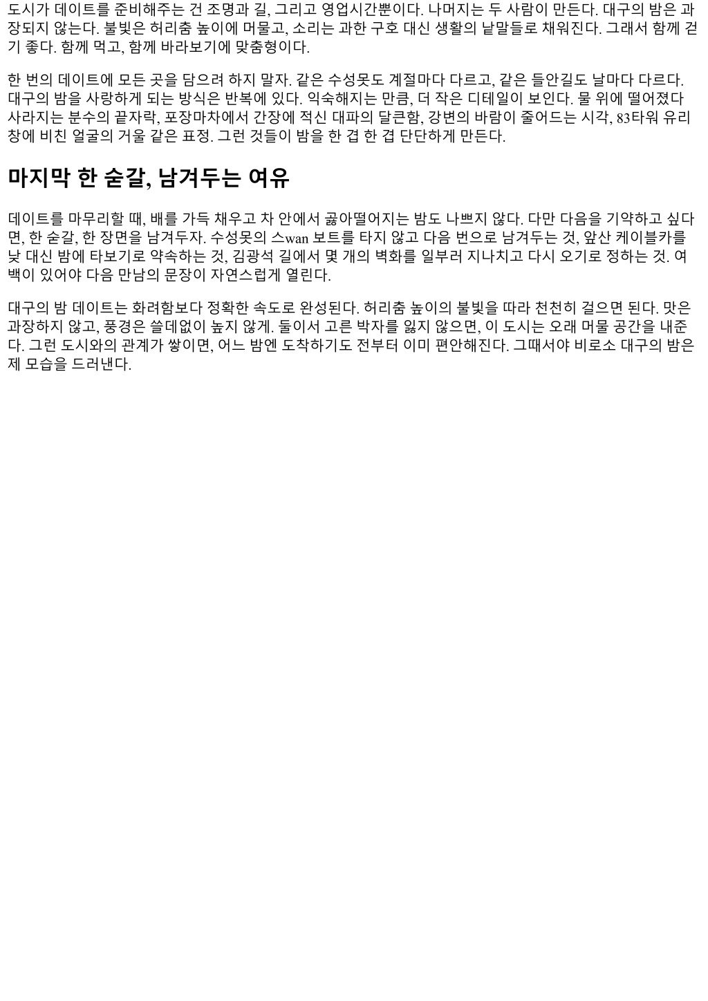 도시가데이트를준비해주는건조명과길, 그리고영업시간뿐이다. 나머지는두사람이만든다. 대구의밤은과 장되지않는다. 불빛은허리춤높이에머물고, 소리는과한구호대신생활의낱말들로채워진다. 그래서함께걷 기좋다. 함께먹고, 함께바라보기에맞춤형이다. 한번의데이트에모든곳을담으려하지말자. 같은수성못도계절마다다르고, 같은들안길도날마다다르다. 대구의밤을사랑하게되는방식은반복에있다. 익숙해지는만큼, 더작은디테일이보인다. 물위에떨어졌다 사라지는분수의끝자락, 포장마차에서간장에적신대파의달큰함, 강변의바람이줄어드는시각, 83타워유리 창에비친얼굴의거울같은표정. 그런것들이밤을한겹한겹단단하게만든다. 마지막한숟갈, 남겨두는여유 데이트를마무리할때, 배를가득채우고차안에서곯아떨어지는밤도나쁘지않다. 다만다음을기약하고싶다 면, 한숟갈, 한장면을남겨두자. 수성못의스wan 보트를타지않고다음번으로남겨두는것, 앞산케이블카를 낮대신밤에타보기로약속하는것, 김광석길에서몇개의벽화를일부러지나치고다시오기로정하는것. 여 백이있어야다음만남의문장이자연스럽게열린다. 대구의밤데이트는화려함보다정확한속도로완성된다. 허리춤높이의불빛을따라천천히걸으면된다. 맛은 과장하지않고, 풍경은쓸데없이높지않게. 둘이서고른박자를잃지않으면, 이도시는오래머물공간을내준 다. 그런도시와의관계가쌓이면, 어느밤엔도착하기도전부터이미편안해진다. 그때서야비로소대구의밤은 제모습을드러낸다.