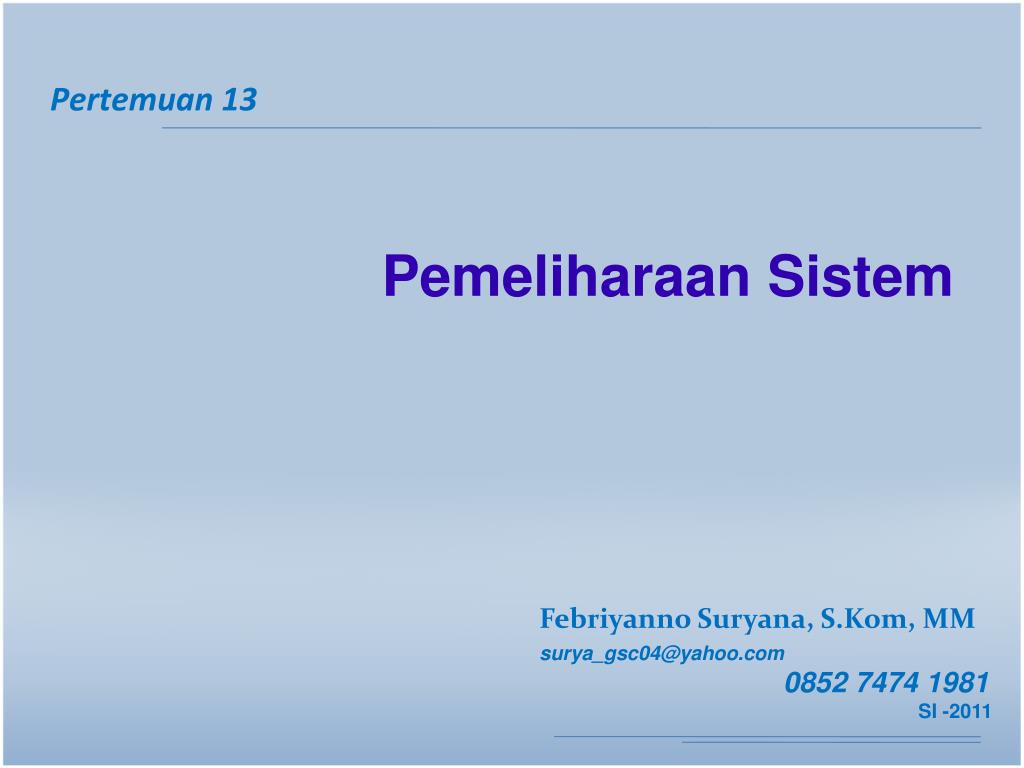 Pertemuan 13 PemeliharaanSistem Febriyanno Suryana, S.Kom, MM surya_gsc04@yahoo.com 0852 7474 1981 SI -2011