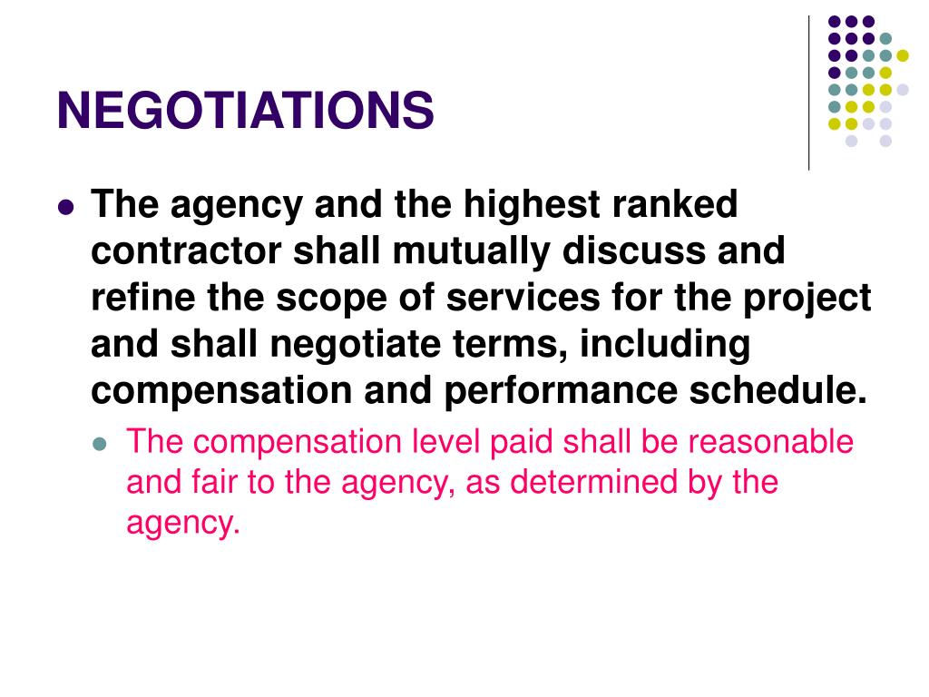NEGOTIATIONS • The agency and the highest ranked contractor shall mutually discuss and refine the scope of services for the project and shall negotiate terms, including compensation and performance schedule. • The compensation level paid shall be reasonable and fair to the agency, as determined by the agency.