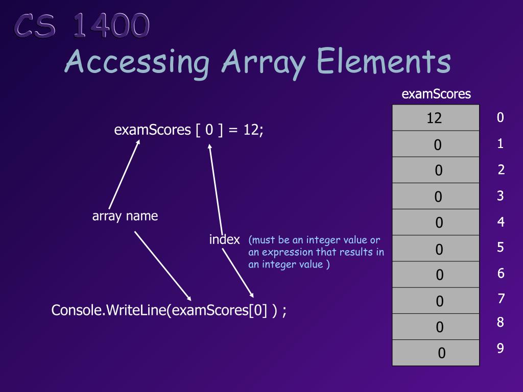 0 0 1 1 2 2 3 3 4 4 5 5 6 6 7 7 8 8 9 9 Accessing Array Elements examScores examScores 12 12 examScores [ 0 ] = 12; 0 0 0 array name 0 index (must be an integer value or an expression that results in an integer value ) 0 0 0 Console.WriteLine(examScores[0] ) ; 0 0