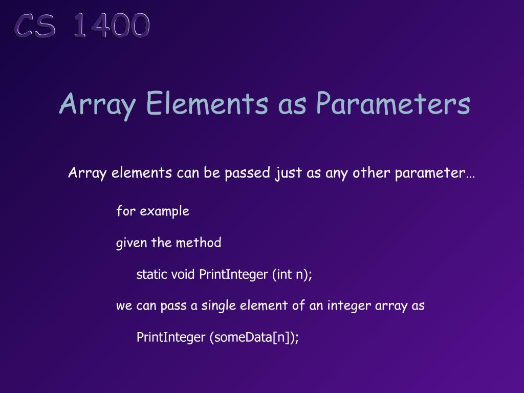 Array Elements as Parameters Array elements can be passed just as any other parameter… for example given the method static void PrintInteger(int n); we can pass a single element of an integer array as PrintInteger(someData[n]);